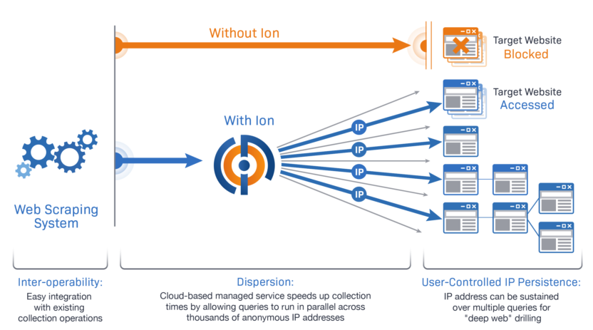 Depending on your needs, Ion can be used as an exploder or in sessions. You maintain control over how often your IP address rotates or how long your IP address remains consistent, allowing for dispersed collection or deep drilling.