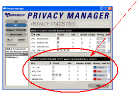with Saved Privacy Levels Saved Privacy Levels list shows the threats for those sites